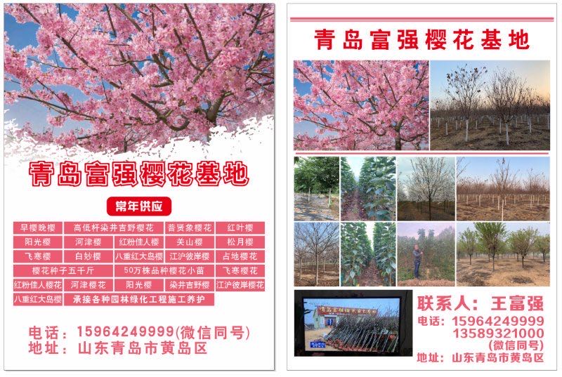 山東青島富強櫻花苗木基地歡迎您(王富強 13780680000、13589321000),青島富強品種櫻花基地常年供應(yīng):早櫻晚櫻,高低桿染井吉野櫻花,陽光櫻,河津櫻,紅粉佳人櫻,關(guān)山櫻,大漁櫻,松月櫻,飛寒櫻,白妙櫻,美利堅櫻,紅花染井吉野櫻,八重紅大島櫻,江滬彼岸櫻,小松乙女櫻,思川櫻,紅山櫻,雅櫻,獎?wù)聶眩酥丶t垂枝櫻等占地櫻花,承接各種園林綠化工程施工養(yǎng)護。歡迎新老客戶來我們這邊考察,購苗買苗服務(wù)。